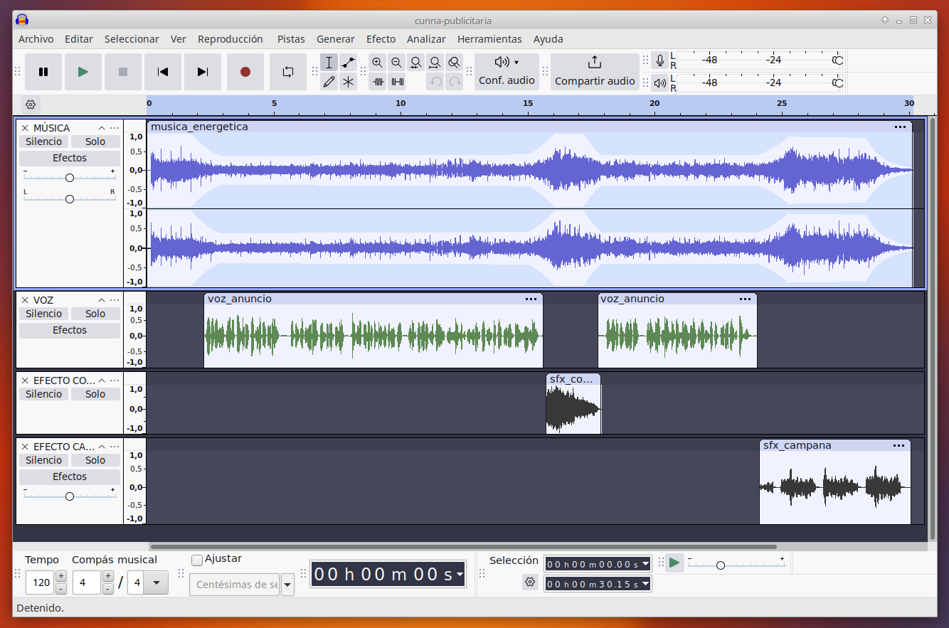 Una vez tengas los cuatro audios, debes proceder con la edición de la cuña publicitaria: