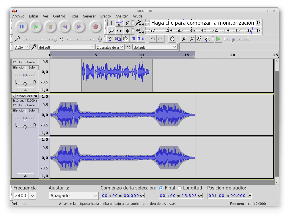 Usa el audio locucion.ogg y brad-sucks_i-dont-know-what-im-doing_06_borderline.mp3 para aplicar la "receta" completa que aparece al final de la presentación del tema.