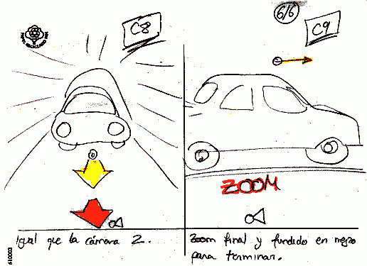 A continuación vemos el storyboard propiamente dicho, en el que esquematizo cada una de las tomas y detalles relevantes. En rojo resalto el movimiento de la cámara y en amarillo la dirección del coche. También es posible ver qué cámara rueda cada secuencia fijándose en los cuadros que aparecen en la esquina superior derecha de cada viñeta: